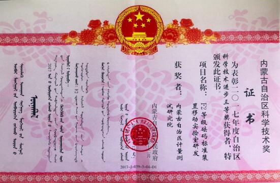 ? ? 內蒙古自治區計量測試研究院研制的“F2等級砝碼標準裝置移動實驗室研發”科研成果榮獲內蒙古自治區科學技術進步獎三等獎。?